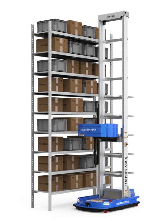 HAIPICKは倉庫の空間を有効活用できるケース搬送型ロボットです。