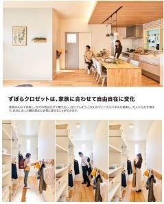 ●通常、間取りが作られた後の余った場所に配置される収納 だが、ずぼらクロゼットは家の中心に配置。家族が必ず通 る、目につきやすい場所なので、それぞれが何かをしながら片付けをすることで家事シェアが実現される。洗面所、キッチ ン、リビングなど、様々な部屋とつながっているので家事動 線も楽。クロゼットは使う人に合わせてカスタマイズできる。