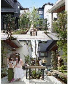 ●田の字型の 4 棟の分譲住宅の中心部に、共有持分によるコモンスペースを設け、落葉樹を植樹。4 戸で維持管理。このオープンガーデンは現代の井戸端。自然に共助や共育が実現し、子どもたちの心にプラスの影響を与える街を開発した。