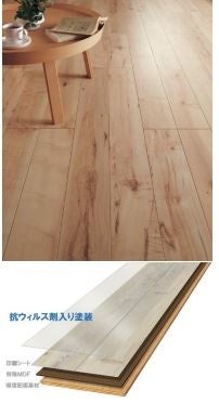 ●ウイルスを含んだ飛沫は床に落ちても数日間は生きるため、 家庭内での感染リスクを減らすために開発。床材表面に抗ウイルス剤、抗菌剤配合の塗装を施した。24 時間後、99%以上のウイルス減少を確認。SIAA(抗菌製品技術評議会)に認証され、ISO21702 法の基準をクリア。皮膚感作性などの安全基準にも準拠し、子どもが舐めても直接肌で触れても安全。