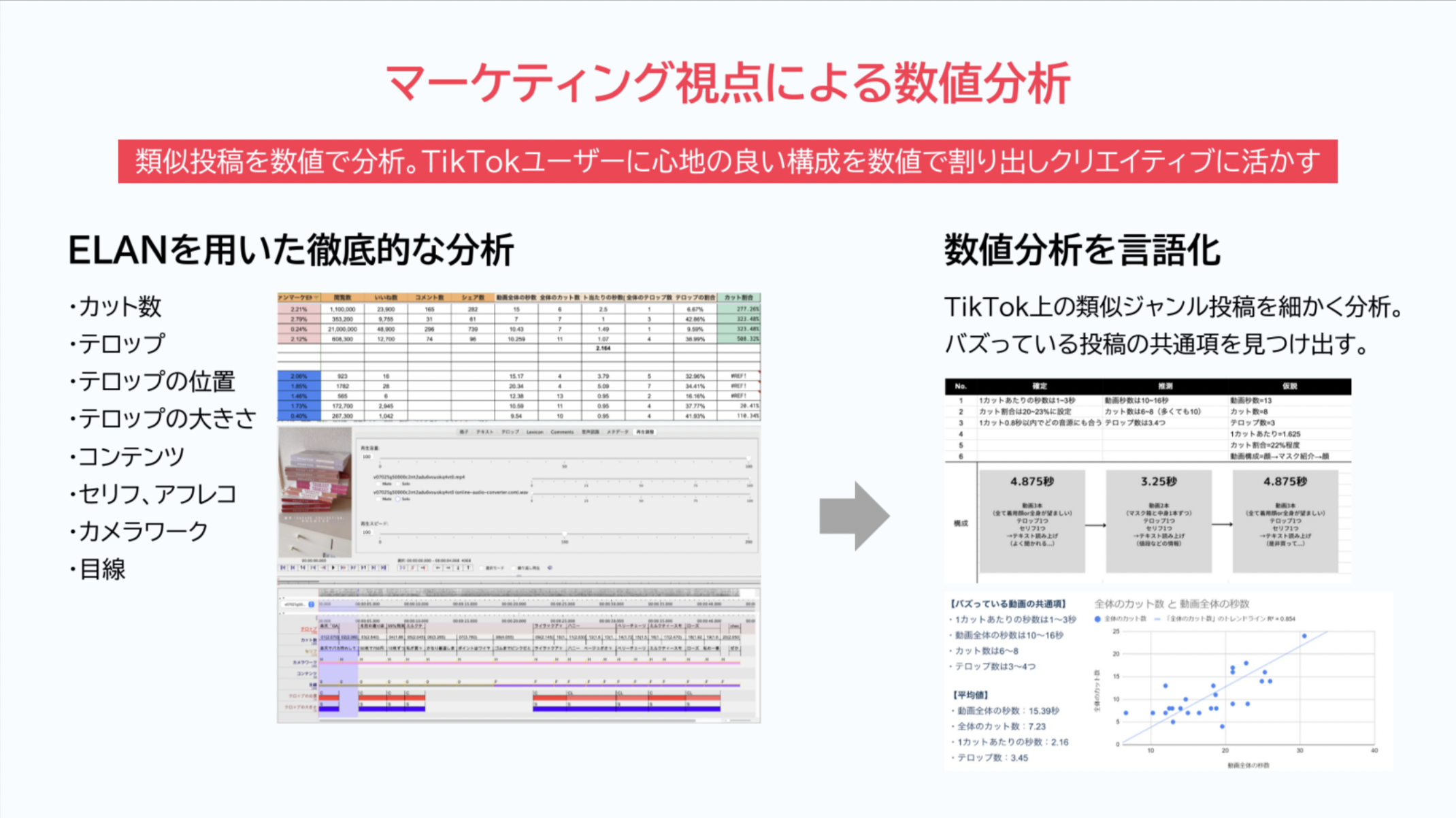 動画解析ツール「ELAN」などを用いた細かい数値的分析を行うことで、以下のようなアウトカムを得ることができるクリエイティブを展開しています。