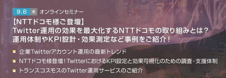 そこで本セミナーではNTTドコモのSNS担当者様にご登壇いただき、Twitter運用の効果を最大化するための運用体制やKPI設計・効果測定について、事例を踏まえたトークセッション形式でご紹介します。