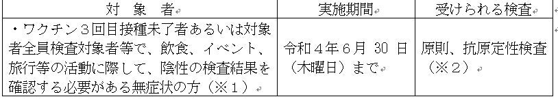 ※1 ワクチン3回目接種が完了している方も、対象者全員検査等及び高齢者や基礎疾患を有する者等との接触を行う活動に際して検査結果を求められた場合には、無料検査の対象となります。(申込みの際にその旨を説明していただく必要があります。)