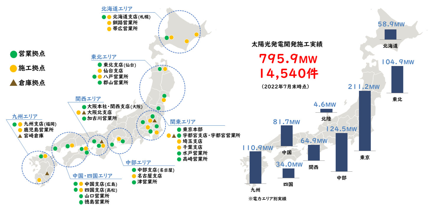 開発実績:14,540件・795.9MW(2022年7月末日時点、太陽光発電開発施工実績)