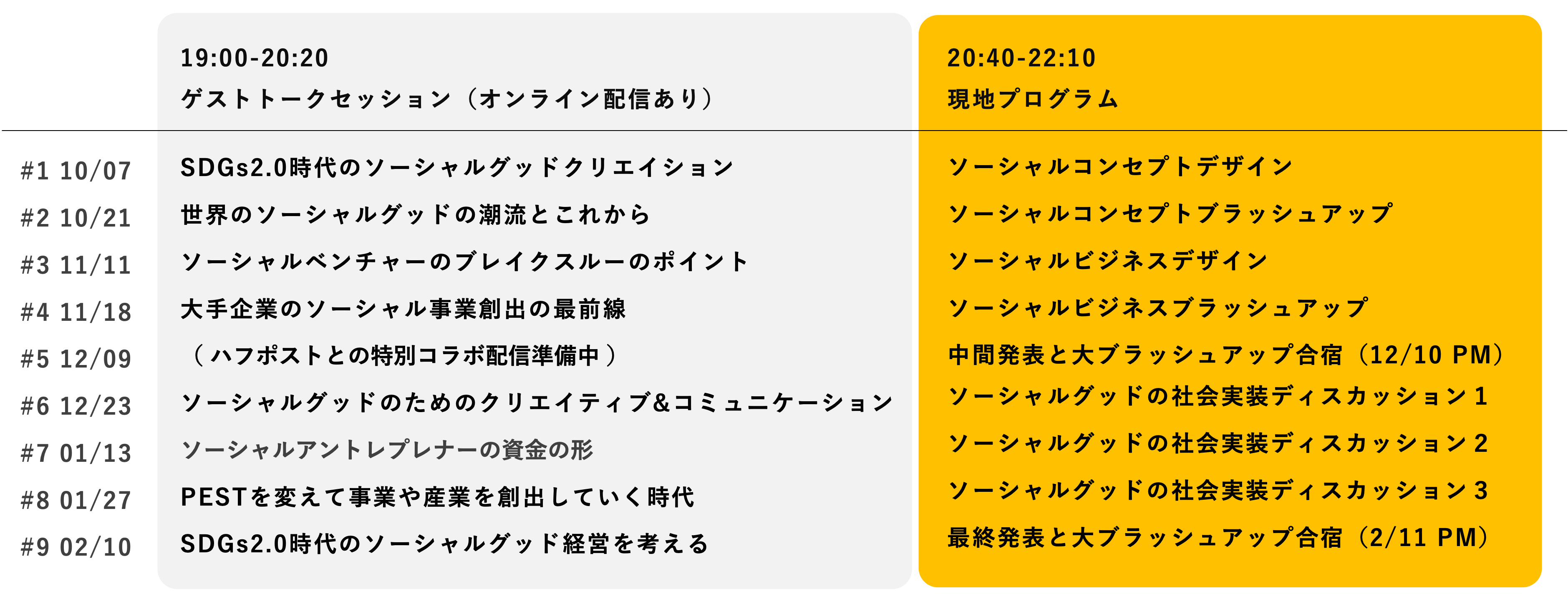 THE SOCIAL GOOD ACADEMIA は、ゲストトークセッションのオンライン配信と現地プログラムを含む全9回のプログラムとなっています。