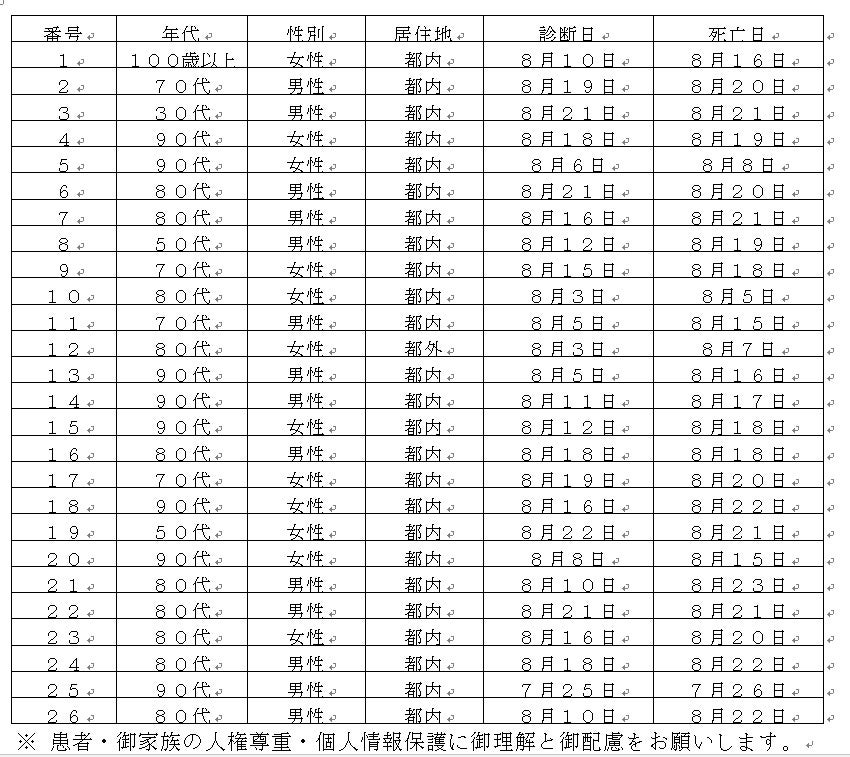 新型コロナウイルスに関連した患者の死亡について business Twitter Facebook はてブ Pocket LINE コピー 2022.08.26 この記事は約1分で読めます。 都内で新型コロナウイルスに感染した方が死亡されましたのでお知らせします。 お亡くなりになった方のご冥福をお祈り申し上げます。