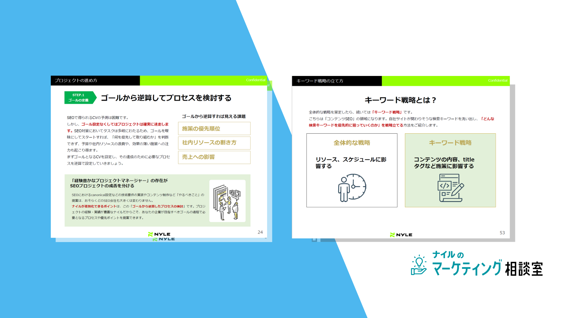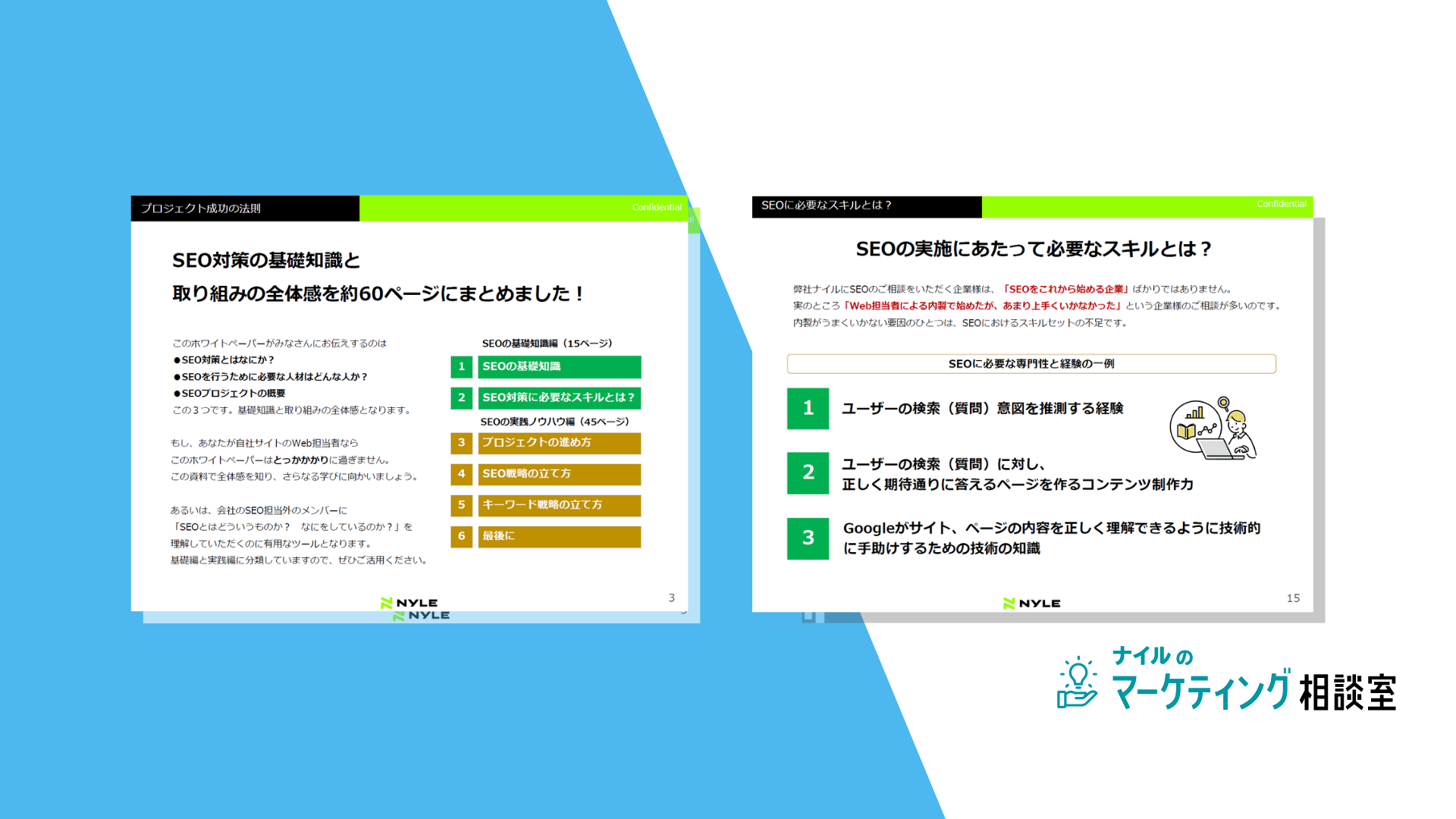 「ナイルのマーケティング相談室」は、制作期間およそ2ヶ月をかけ、SEOの基礎知識から実践方法までを全96ページにまとめました。SEOをこれから始める初心者の方、SEO対策に行き詰まっている方、全てのサイト担当者が読んだ後 “すぐに実践したくなる” お役立ち資料です。