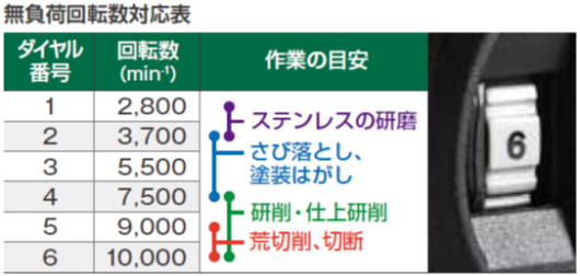 作業用途に応じて回転数を2,800~10,000min-1の間で無段階に変速が可能で、効率よく作業ができます。