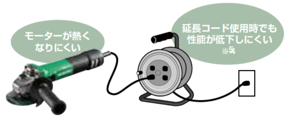延長コード使用時など、電源事情が悪い状態でも電圧降下の影響を受けにくく、性能低下の少ない安定した作業が可能です。