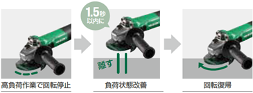 高負荷作業で回転が停止した後、従来製品では再起動のためスイッチを入れ直す必要がありましたが、回転復帰制御の搭載により、1.5 秒以内に負荷状態を改善すると自動で回転が復帰するため、作業時の手間が軽減されました。