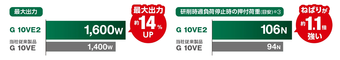 最大出力が1,600Wとよりパワフルに作業ができるようになりました。当社従来製品(G 10VE)よりも、約14%最大出力が上がっただけでなく、研削時過負荷停止時の押付負荷は約1.1倍ねばり強くなりました。