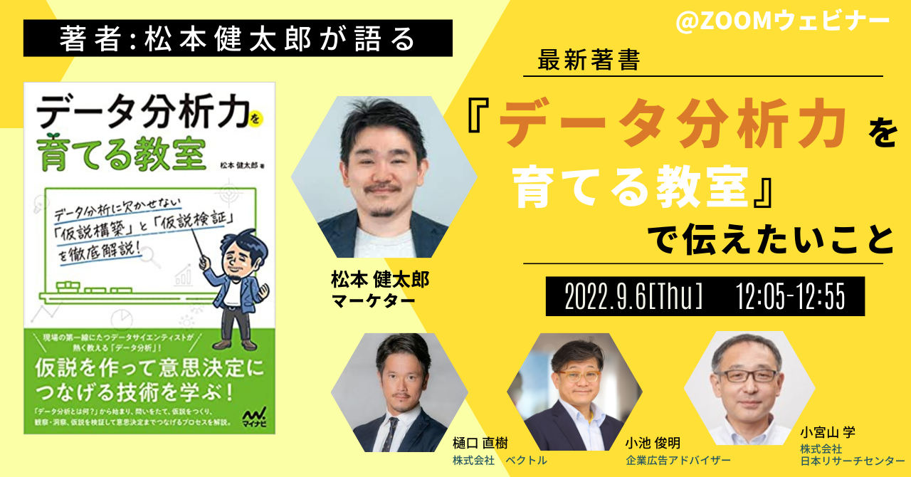 - 内 容: 本ウェビナーは、数々のマーケティング書籍を手掛ける松本健太郎さん(レギュラーパネラー)から、最新著書『データ分析力を育てる教室』で伝えたいことを徹底解説していただきます。本書で解説されている、データとは何か、データ分析から何がわかるのか、何のためにデータ分析を行うのか、「仮説構築」と「仮説検証」の内容から、松本様がお伝えしたい点をさらにピックアップしていただき、レギュラーパネラーとの対話形式で紐解いていきます。