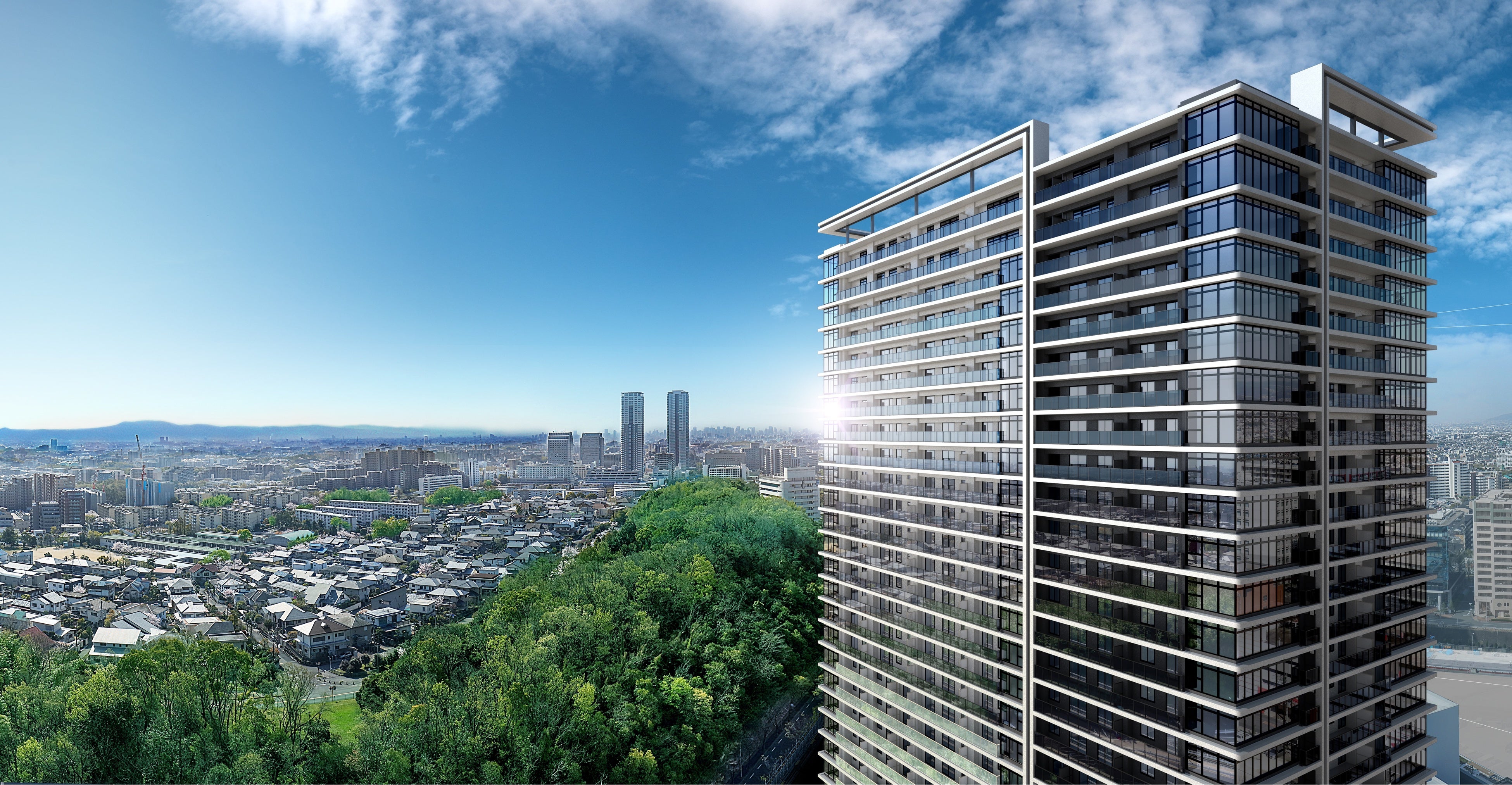 ・新たなランドマークとなる高さ約100mの本物件は、標高約102m(国土地理院地図調べ)の北摂の高台地に誕生します。高層建築が少ない箕面市において地上30階建てとなる本物件は、千里中央方面に開かれた千里ニュータウンや千里緑地が眼下に広がる眺望を享受できます。