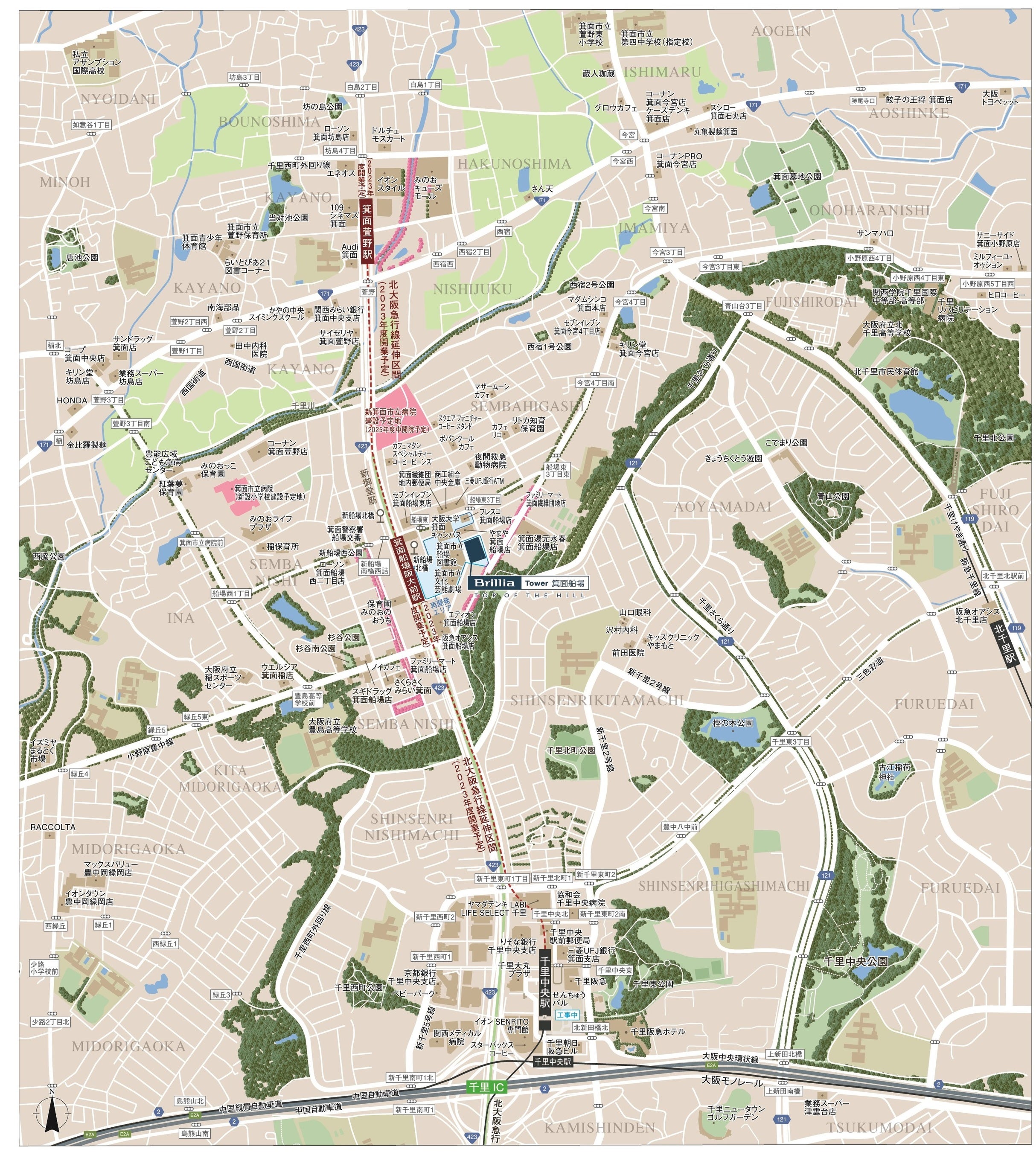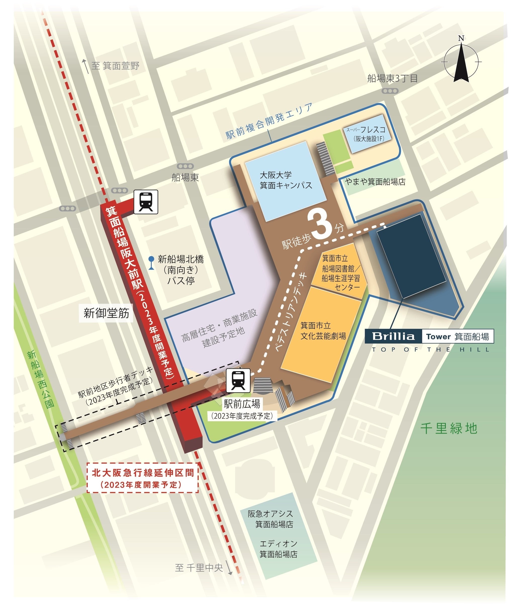 ・本物件が位置する複合開発エリアは、エリア全体がペデストリアンデッキで結ばれ、ペデストリアンデッキ上は車道や信号もなく、歩行者の安全性や快適性が確保されます。当該エリアには大阪大学箕面キャンパス、箕面市立船場図書館、箕面市立文化芸能劇場などがすでに誕生しており、アカデミックな雰囲気に包まれた美しい街並みを形成しています。新駅周辺では新たな商業施設が予定されているほか、小学校や市立総合病院の整備も計画されています。