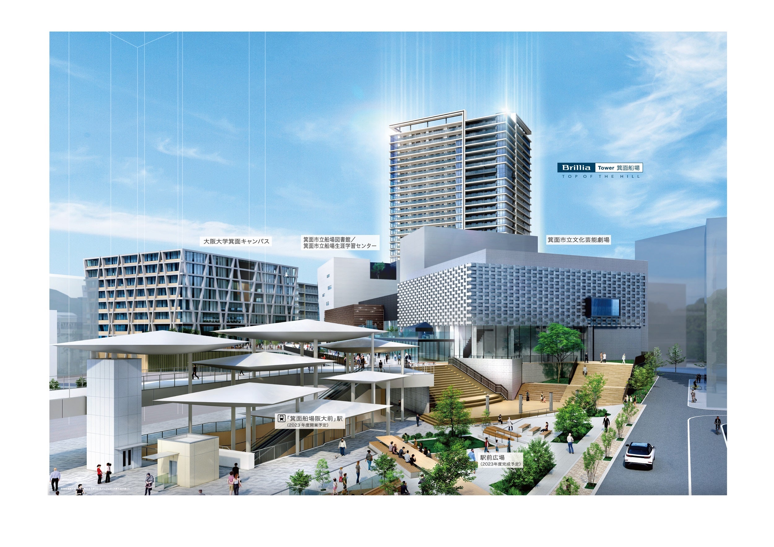 また、本物件が位置する複合開発エリアは、既に大阪大学箕面キャンパスをはじめ、箕面市立船場図書館、箕面市立文化芸能劇場が整備され、今後店舗なども整備されます。新駅周辺では、既存の様々な生活利便施設が整う中、新たに、商業施設や総合病院、小中学校などが予定され、一層の利便性向上が期待できます。
