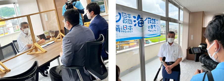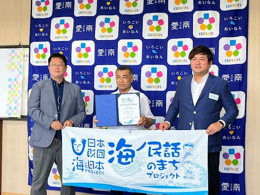 日本中に残された海にまつわる民話を発掘し、その民話のストーリーと、そこに込められた「想い」「警鐘」「教訓」を、親しみやすいアニメーションとして映像化します。当日は、認定委員長をはじめとする事務局メンバーが「海ノ民話のまち」として認定した15のエリアのうちの1つである愛媛県愛南町の清水雅文町長を表敬訪問し、「海ノ民話のまち」認定証贈呈式を行いました。