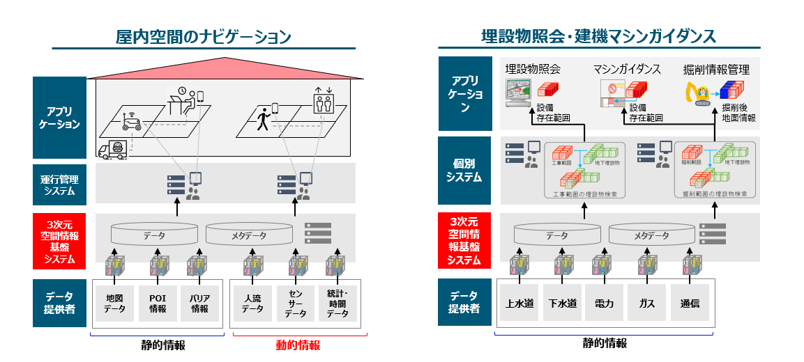 図2 屋内空間の移動・輸送支援(左)、空間IDを活用した地下インフラマネジメントの