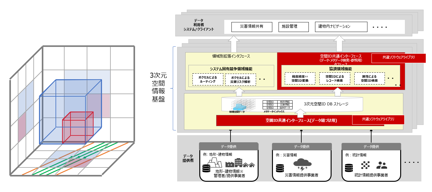 図1 空間ID(左)と、3次元空間情報基盤システム(右)の概念図