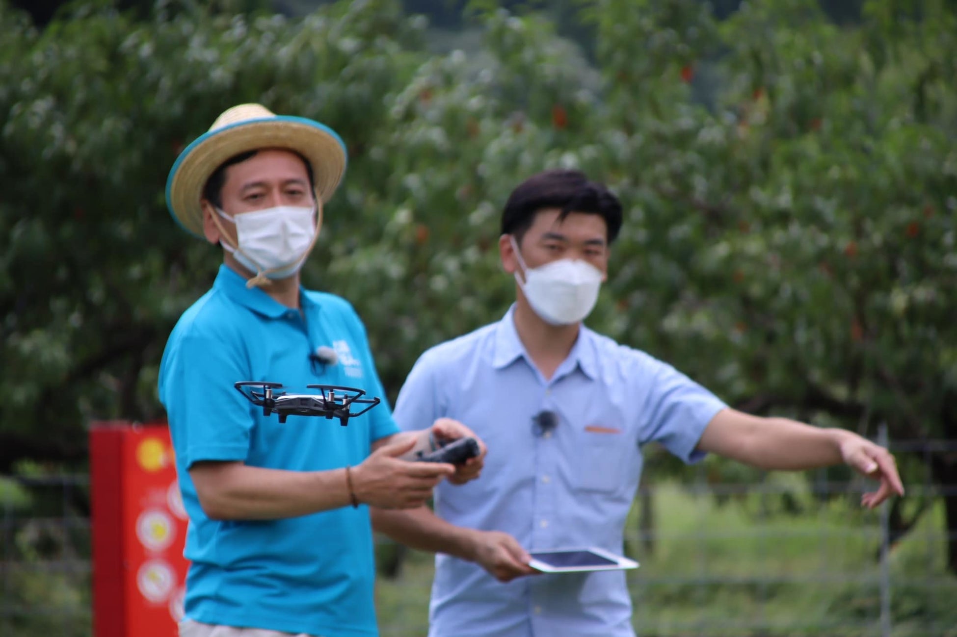 (かつやく隊長の笹川氏よりドローン操縦体験を受ける山口知事)