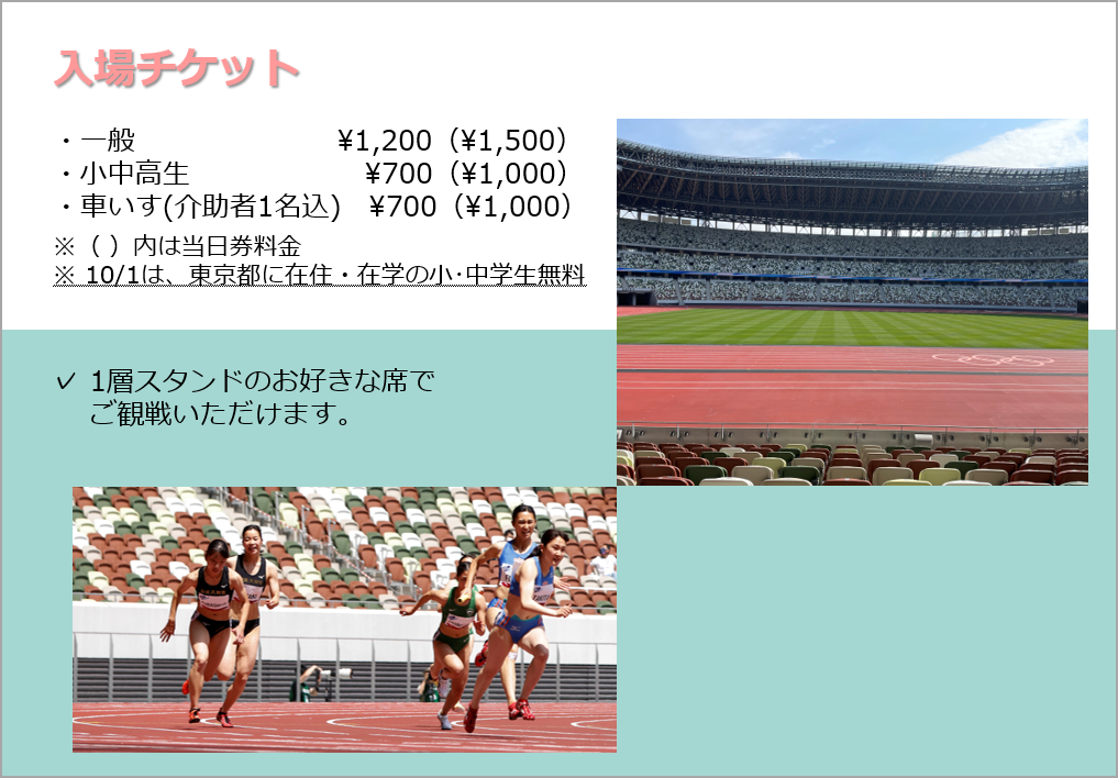 ※「都民の日」の10月1日(土)は、東京都に在住・在学の小・中学生の方は無料でご入場いただけます!大会当日、国立競技場の外苑門側Eゲート横のチケットボックスで、学生証などの東京都在住・在学が証明できるものをご提示いただき、無料チケットをお受け取りください。