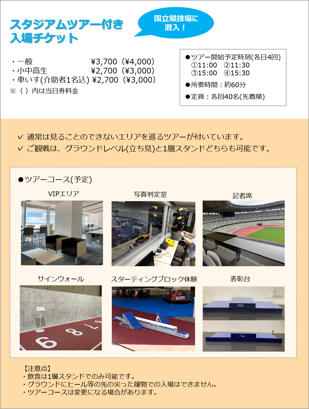 今回は、「グラウンド観戦付きチケット」・「スタジアムツアー付きチケット」・「スターター体験付きチケット」の国立競技場をたっぷりと楽しめる3つの体験付きチケットをご用意いたしました。数に限りがありますので、お早めにご購入ください!