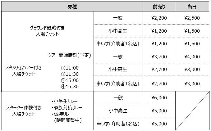※スタジアムツアーの開始時刻やスターター体験の実施時間は予定となります。最新の情報はこちら(https://www.jaaf.or.jp/relayfes/2022/ticket/)をご確認ください。