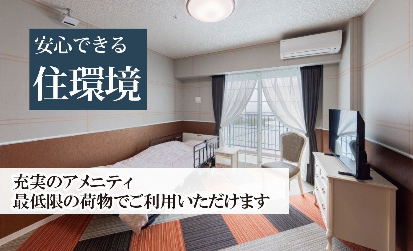期間は1泊2日からご利用ができ、介護施設だからこそ安心して任せられる介護・医療サービスやサポートと、ホテルのような内装とおもてなしをご体感いただけます。