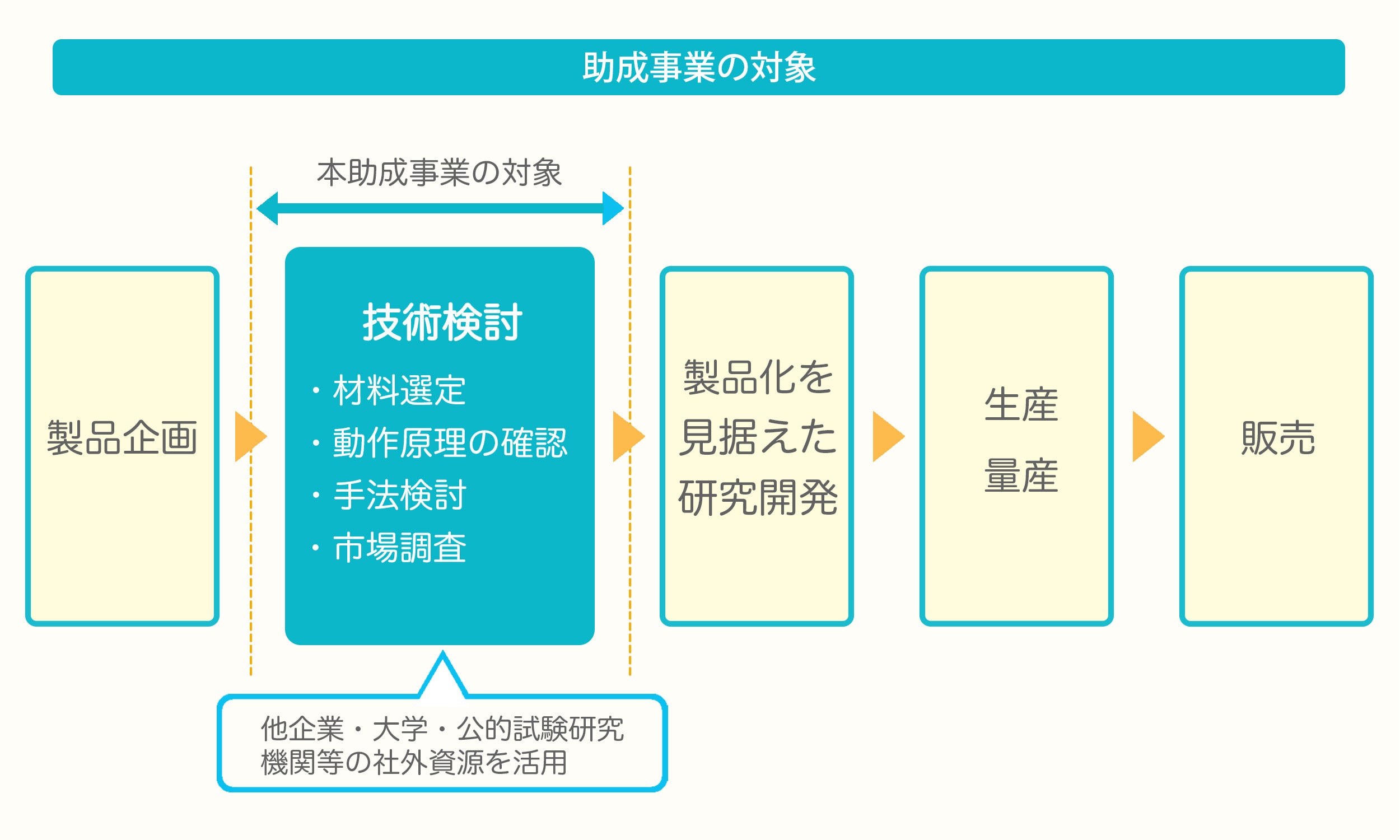 製品開発前の「技術検討の実施」自体を助成対象としているため、製品として完成する必要はありません。検討の結果、開発の方向性を転換することも可能です。