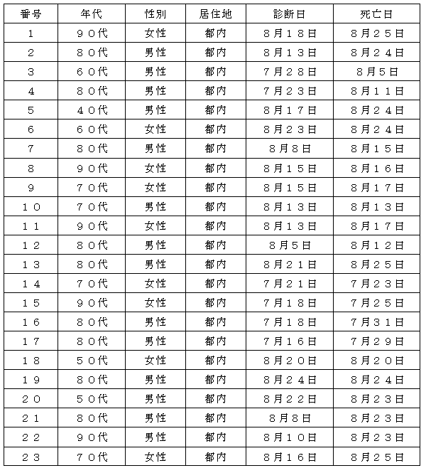 新型コロナウイルスに関連した患者の死亡について business Twitter Facebook はてブ Pocket LINE コピー 2022.08.28 この記事は約1分で読めます。 都内で新型コロナウイルスに感染した方が死亡されましたのでお知らせします。 お亡くなりになった方のご冥福をお祈り申し上げます。 ※ 患者・御家族の人権尊重・個人情報保護に御理解と御配慮をお願いします。