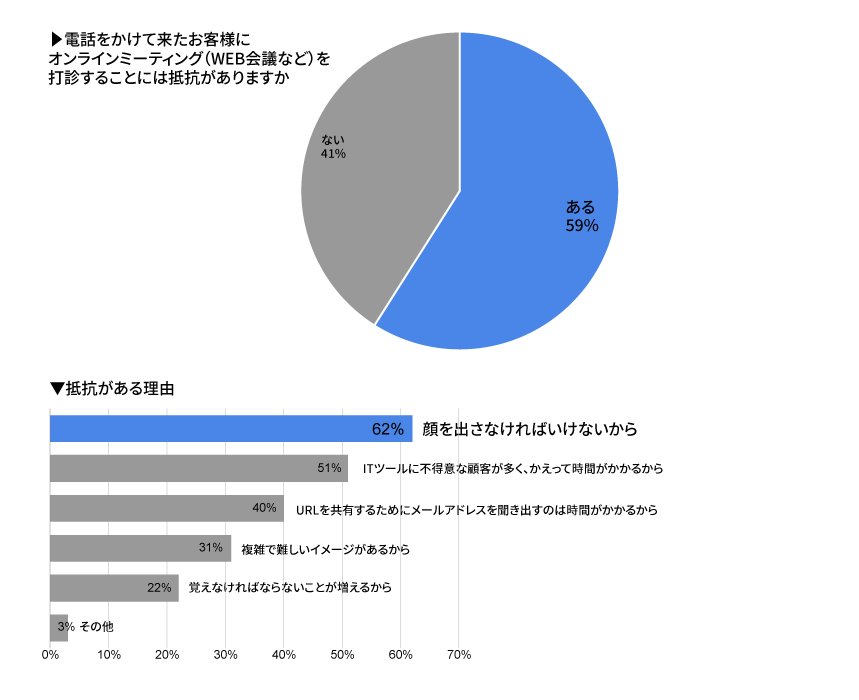 「電話をかけてきたお客様にオンラインミーティングを打診することに抵抗がある」は59%の回答が集まっています。