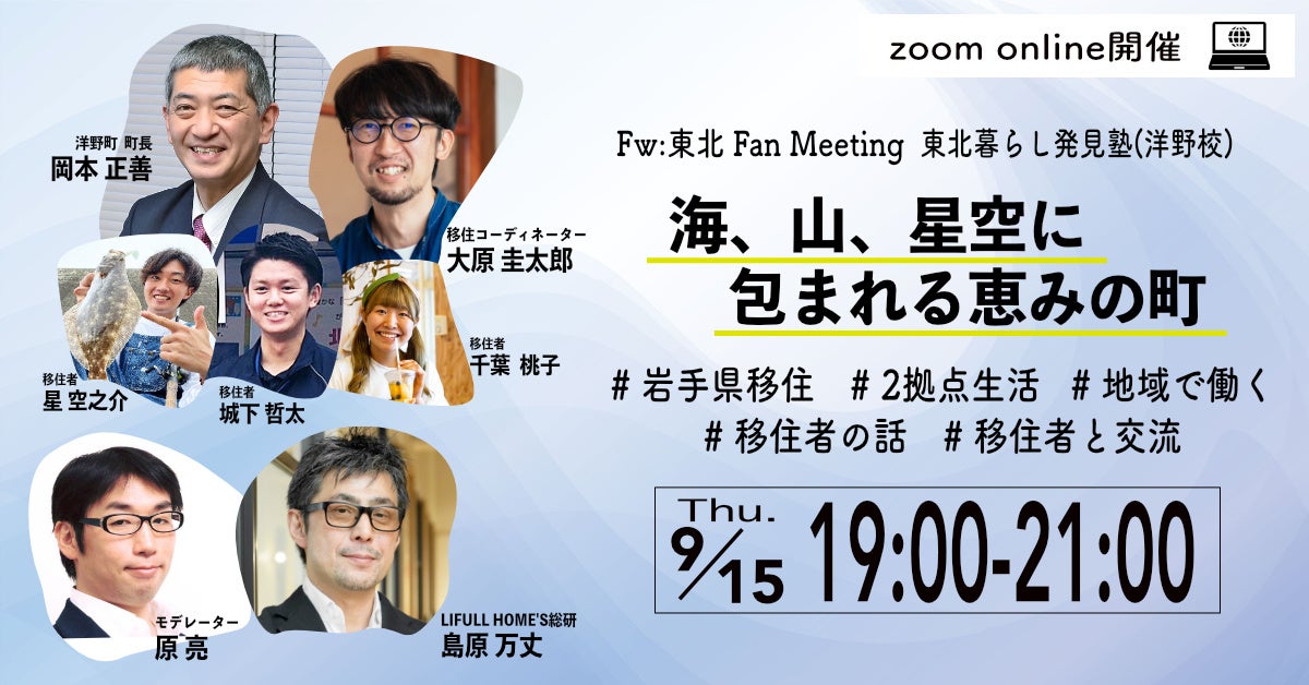 さらに、LIFULL HOME’S総研所長の島原万丈さんも迎え、「社会や環境がよくなって、そしておもしろい」をテーマとした未来をつくる SDGsマガジン「ソトコト」との連動企画としても、洋野町への移住をリアルに掘り下げていきます。移住を知り、地域を知り、みなさんの新たな歩みにつながるきっかけをつかんでみませんか。