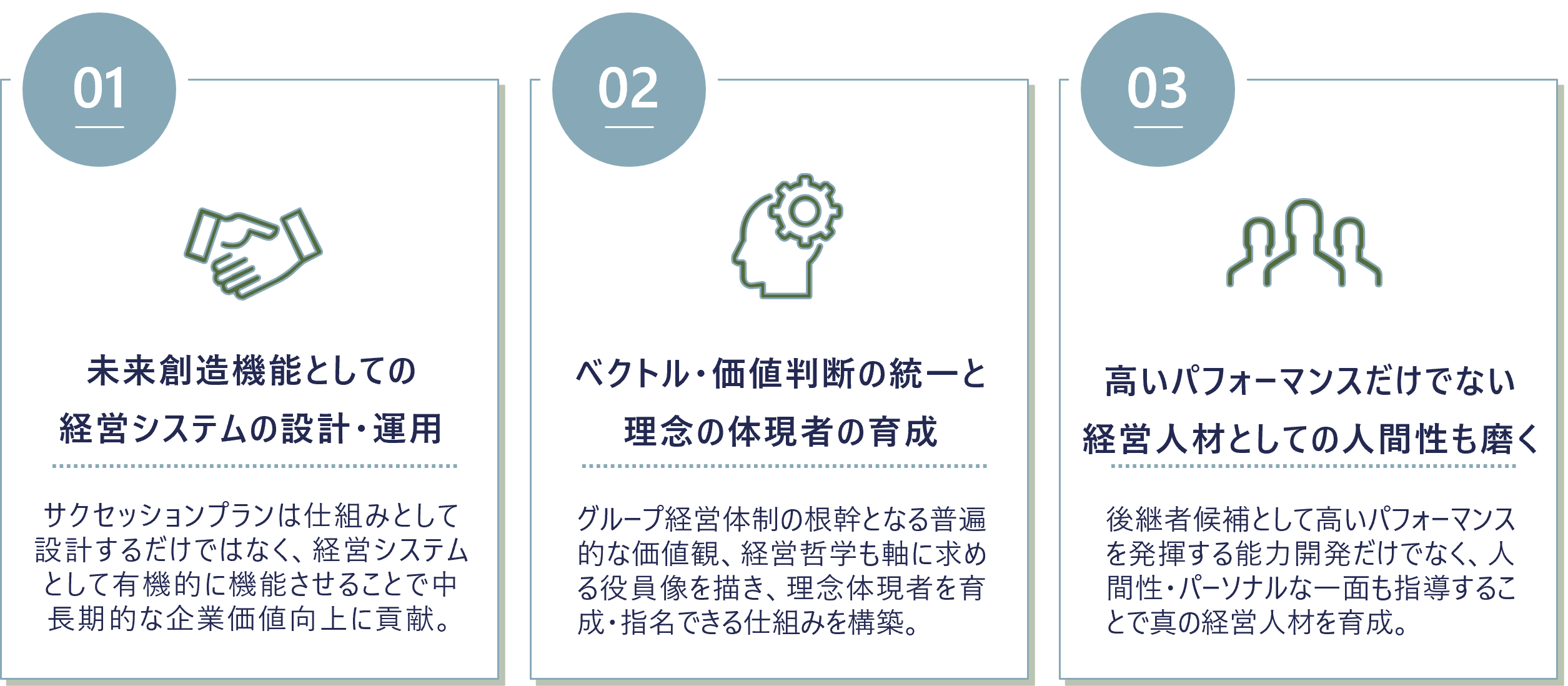 フェーズ1では現状の取締役指名・育成施策の状況の整理を行ったうえで、全体の方針・骨子を策定します。フェーズ2では、運用機関の立ち上げを行い、求める役員像に照らし合わせて、それらの人材をどのように選抜・選解任を行うかの詳細設計を行います。フェーズ3では一連のサクセッションプランの運用を行います。育成については、研修だけではなく、配置・異動や内省を通じた成長を促す施策、人材プールにおける評価・入れ替えの検討を行います。仕組みとして設計するだけではなく、経営システムとして有機的に機能させ、ベクトル・価値判断の統一と理念の体現者を育成。さらに、後継者候補として高いパフォーマンスを発揮する能力開発だけではなく、人間性・パーソナルな一面も向上させることで、真の経営人材を育成します。