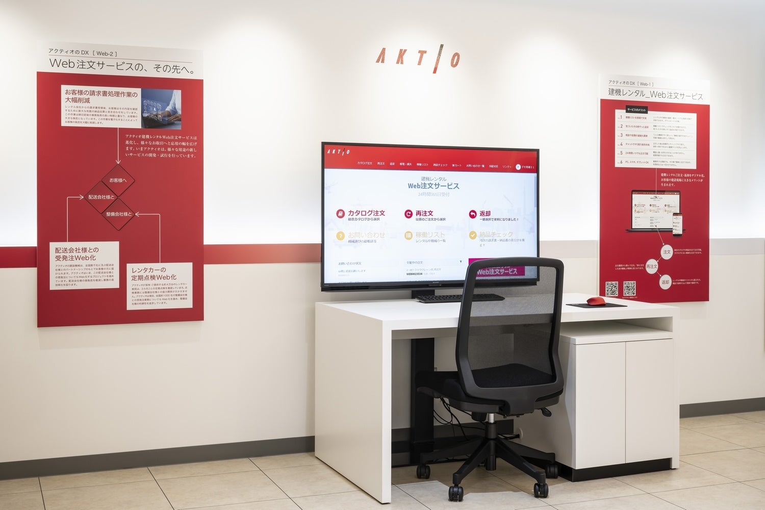 さらに、アクティオのDXとして進めている「アクティオ建機レンタルWeb注文サービス」を実際に体験できるデモ機を設置しました。Web注文サービスの特徴である、いつでも・どこでも、オンライン上から簡単に注文、返却が可能といったことや、通常の注文はもちろん「前回と同じものを再注文する」、「現場の機械をリストから選択して返却する」、「今借りている機械の一覧を、現場でいつでも共有できる」といった、DXのスピーディーな操作性を体感できます。