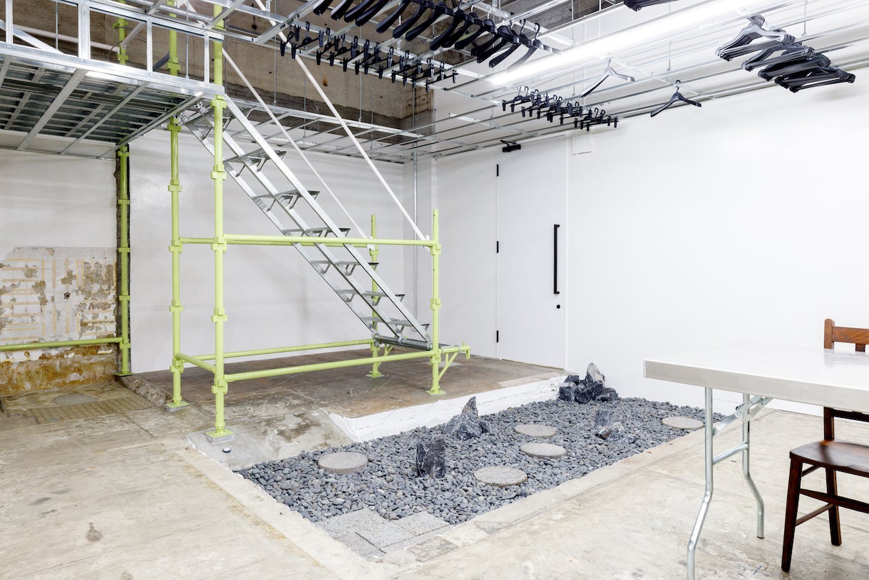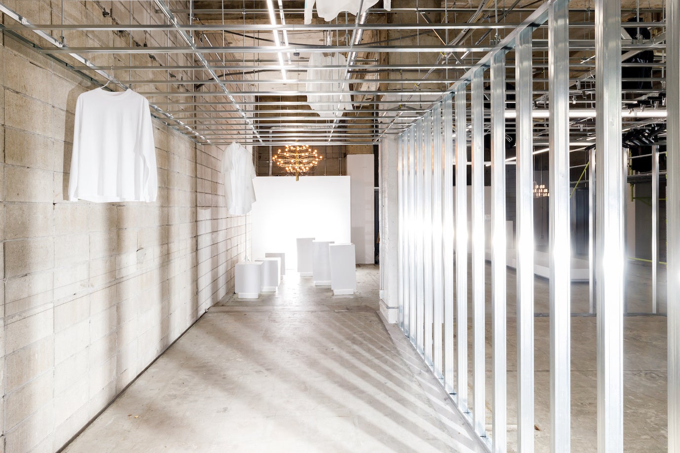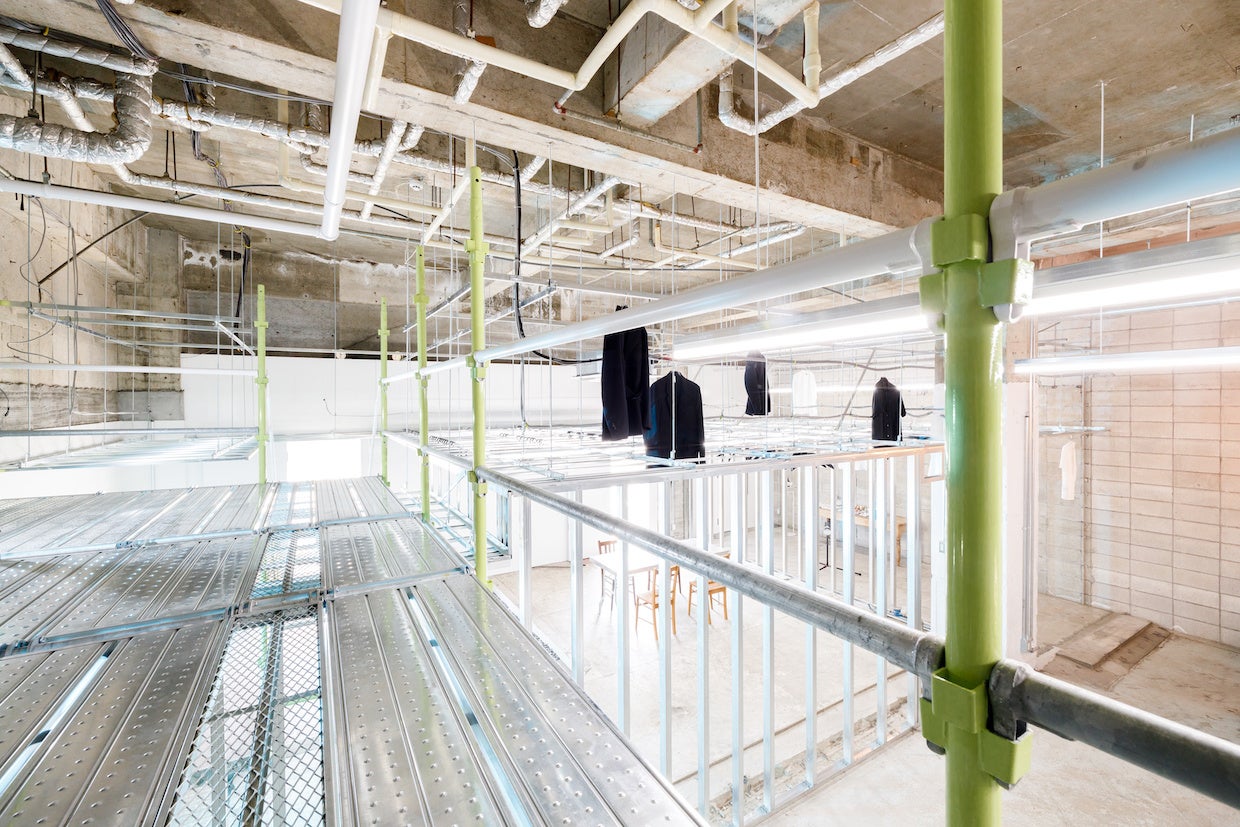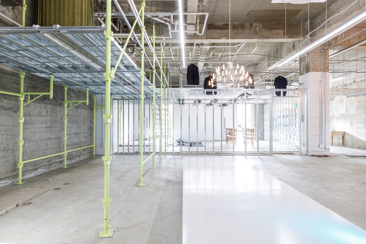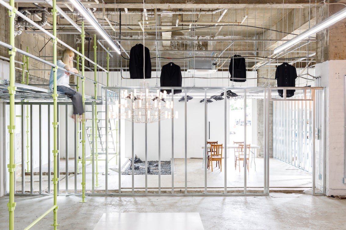 今回のデザインではその緊張感は維持しつつ、ACRMTSMが持っている雰囲気を表現し、間仕切りは全てP Bなどは貼らずL G Sのみで構成。概念としての壁で構築し、スタッドのピッチを少しづつ変えることでみる角度によって見える範囲が変わるように工夫を施しました。中二階として足場材を設け店舗内のショーケースとして利用しています。