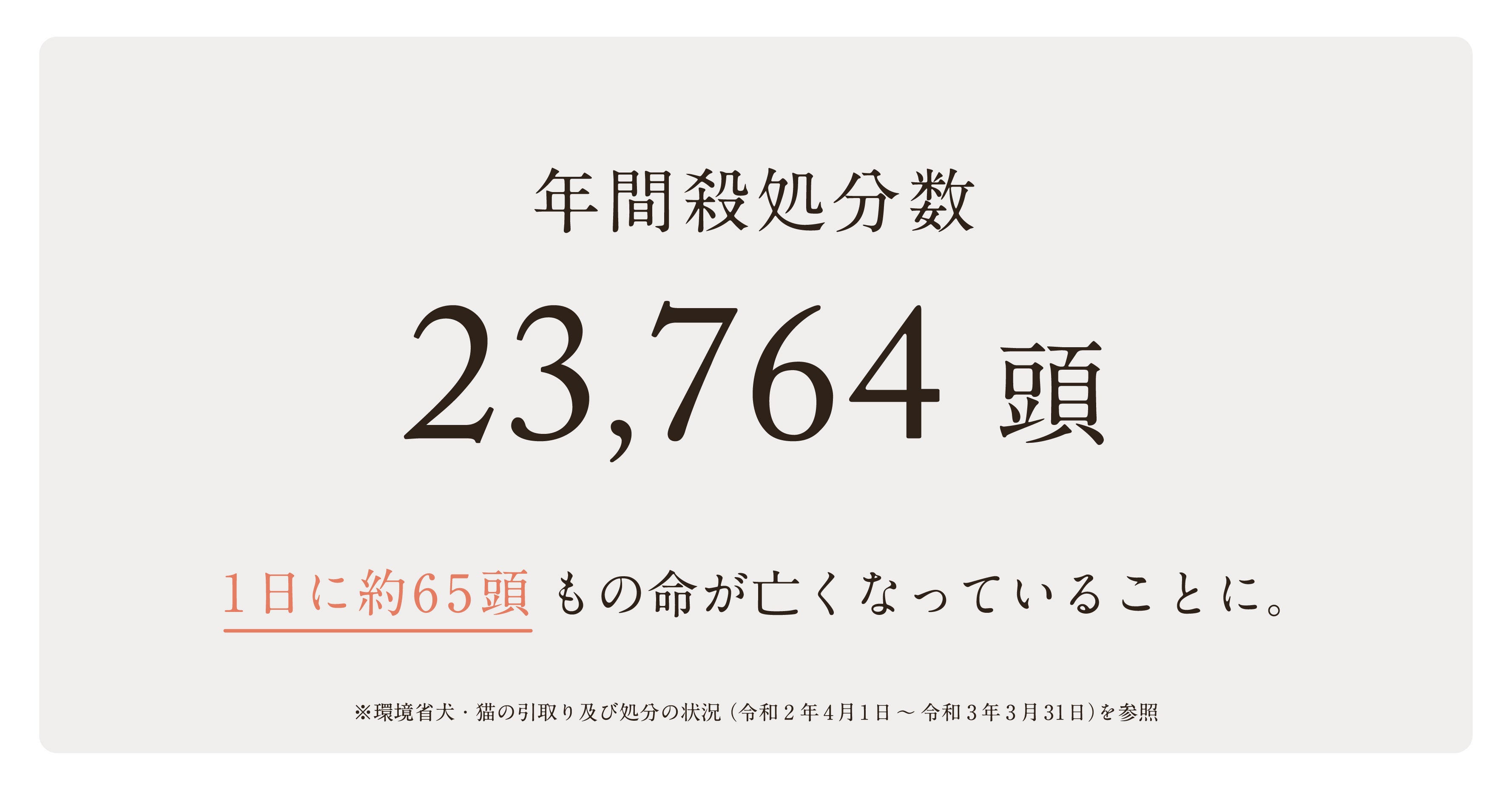 ⽇本の殺処分をめぐる問題は、年々改善傾向にあるものの、いまだ年間2万3千頭以上もの⽝・猫の殺処分が⾏われています。