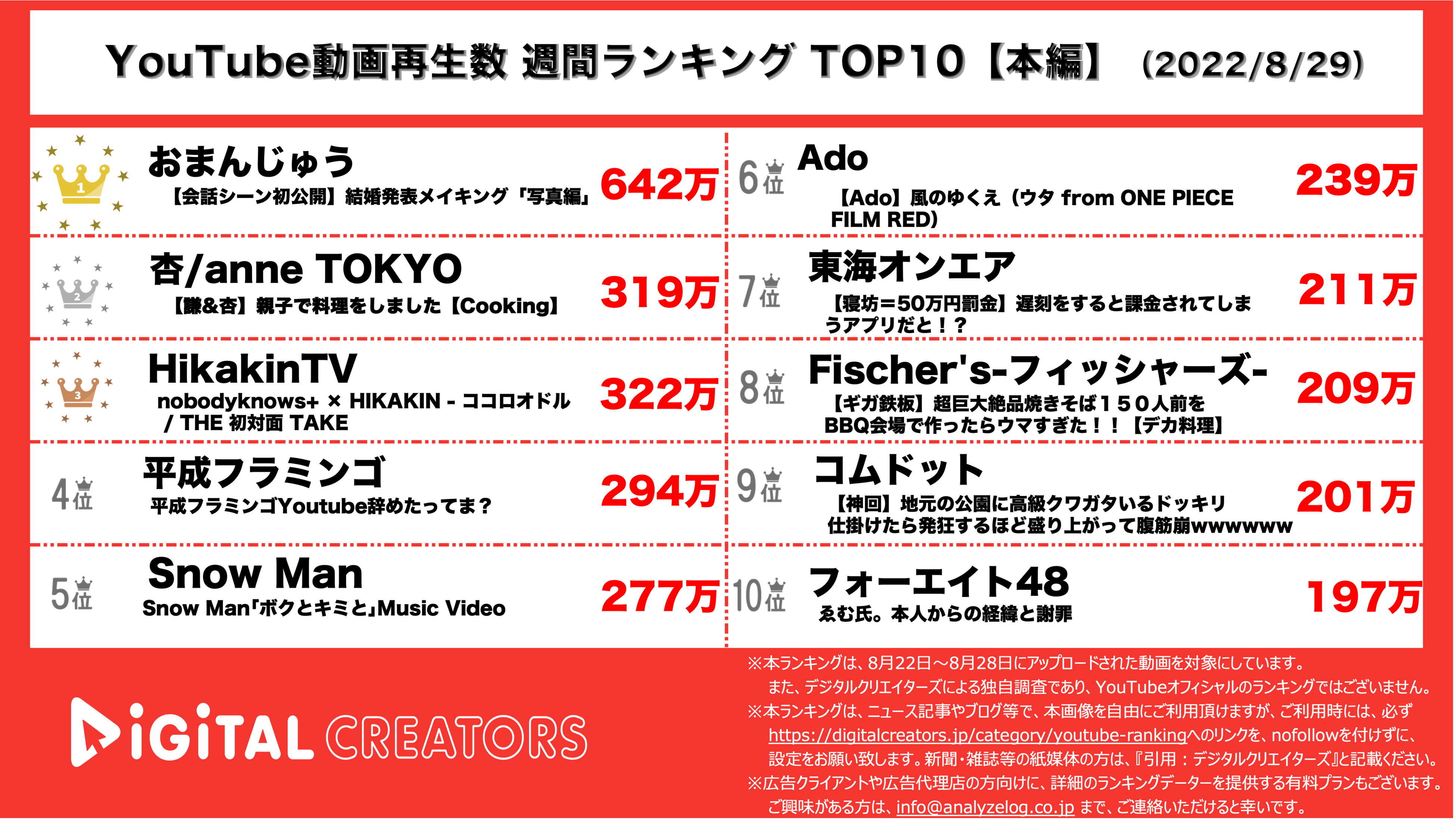先週1位を獲得していた『Ado』は『風のゆくえ』が6位にランクインしており、『杏/anne TOKYO』も含め、コロナ感染から回復した『平成フラミンゴ(4位)』や、『フォーエイト48(10位)』など、女性YouTuberが話題を集めた1週間になったのではないか