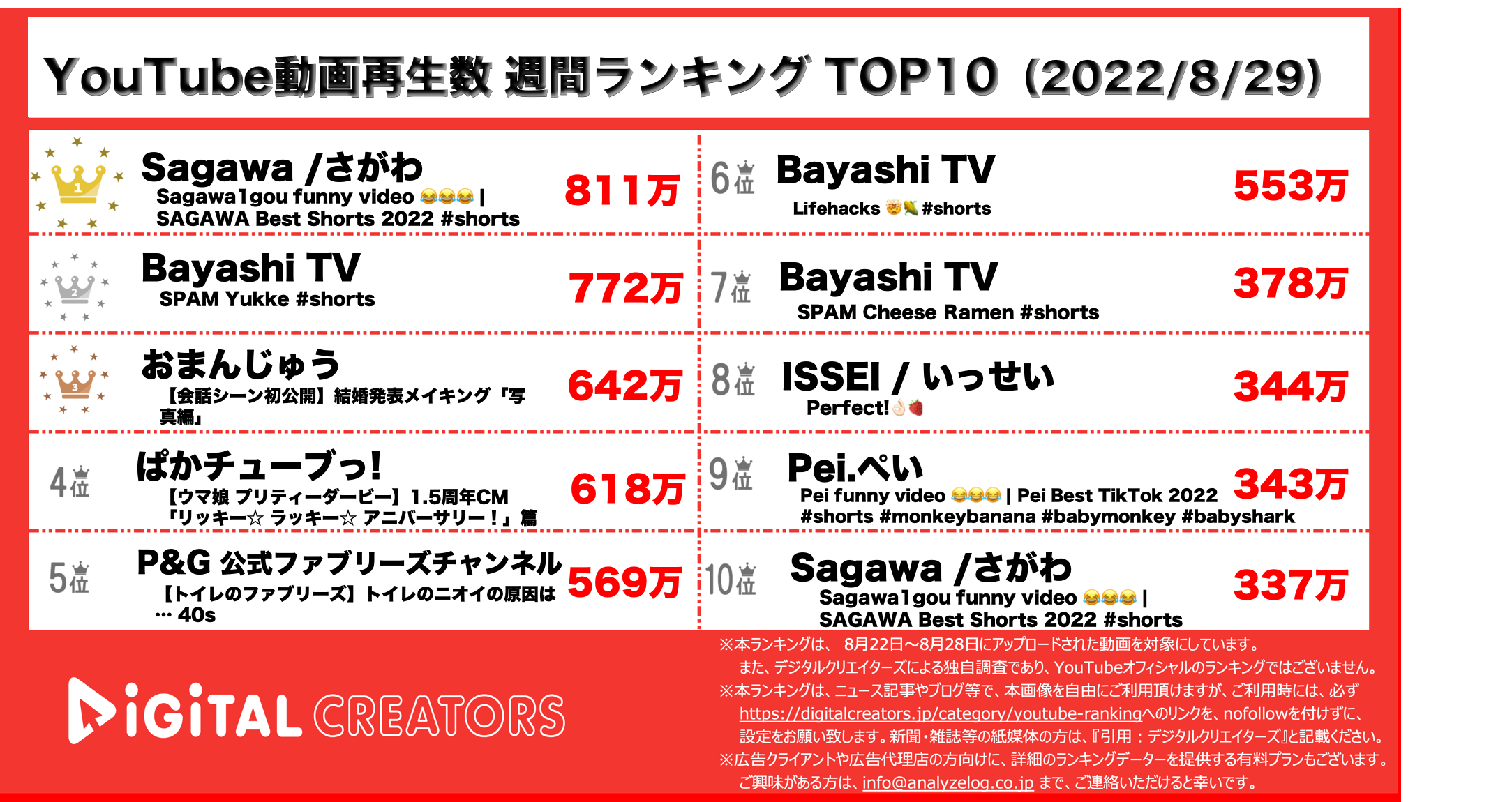 - 【Digital Creators】YouTubeで人気の動画を週間ランキングで発表。