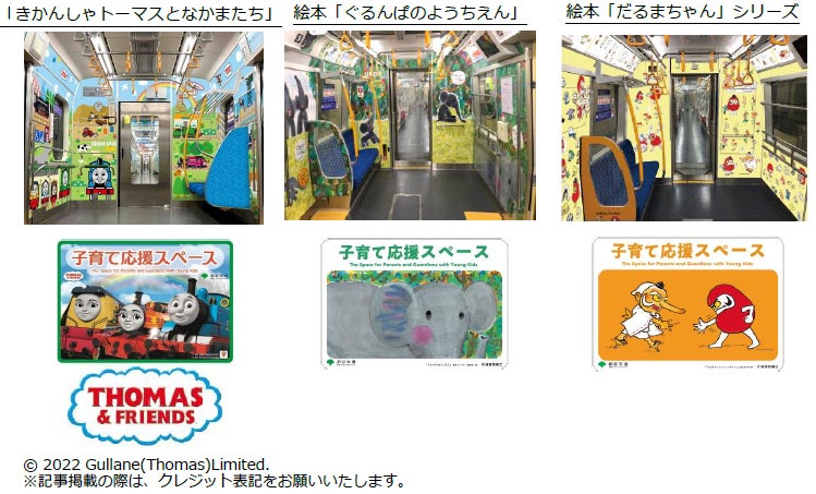 都営地下鉄では、小さなお子様連れのお客様にも安心して気兼ねなく電車を利用していただけるよう、令和元年7月から大江戸線において「子育て応援スペース」を設置し、現在13編成(「きかんしゃトーマスとなかまたち」7編成、絵本「ぐるんぱのようちえん」3編成、絵本「だるまちゃん」シリーズ3編成)で運行しています。