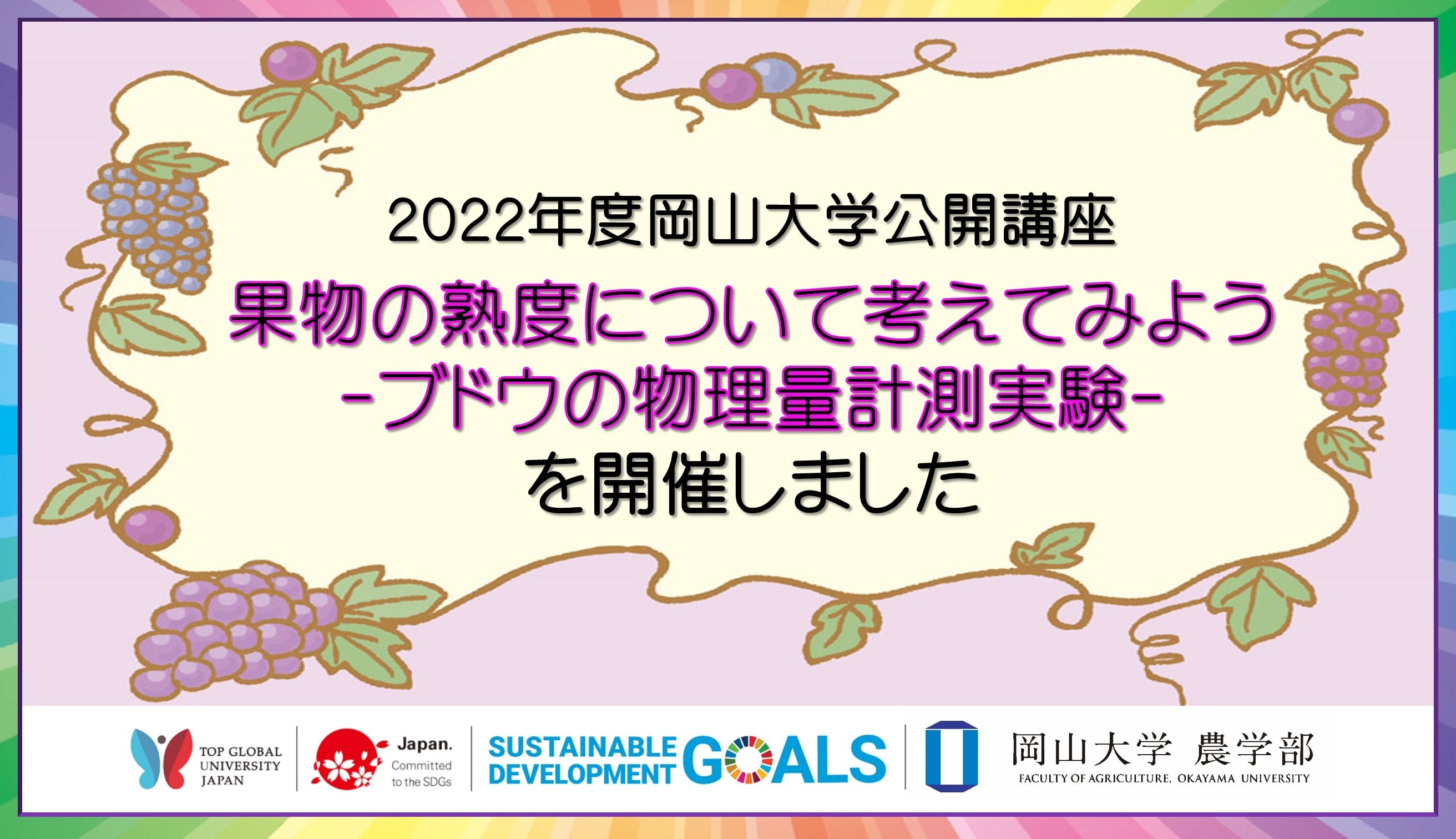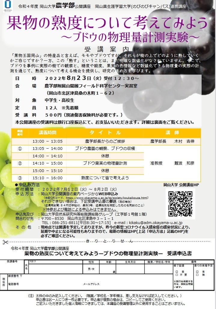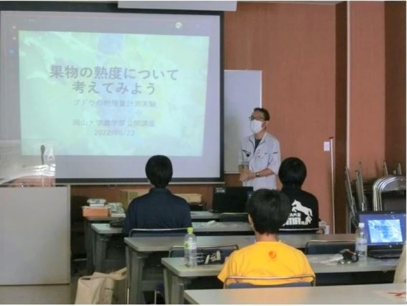 国立大学法人岡山大学(本部:岡山市北区、学長:槇野博史)農学部の今年度の公開講座は「果物の熟度について考えてみよう」と題して、夏休み中の2022年8月23日に、中高生を対象として開講しました。直前の感染急拡大もあって、キャンセルが相次ぎ当日は6名の参加となりましたが、その分充実した時間を過ごしてもらえました。