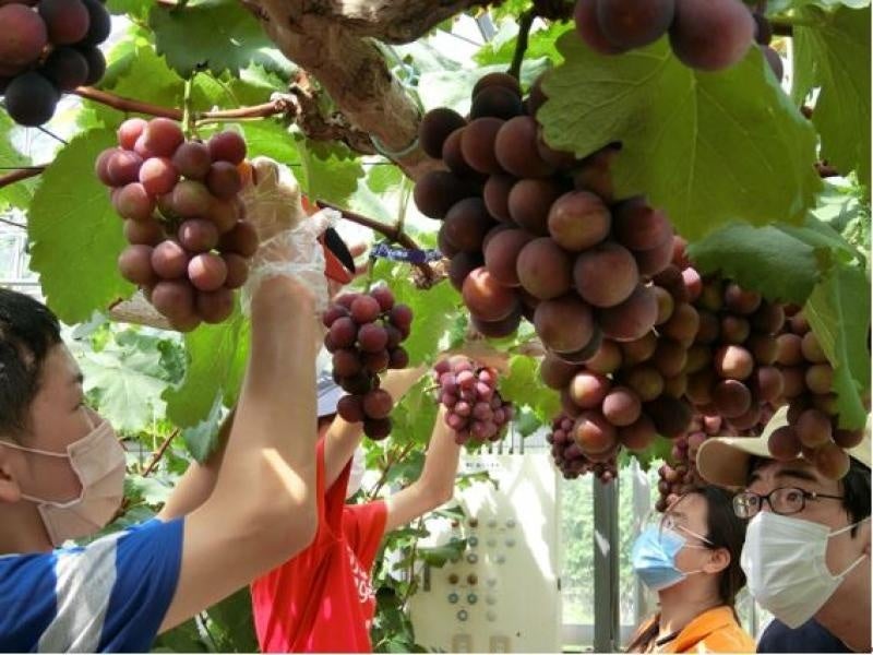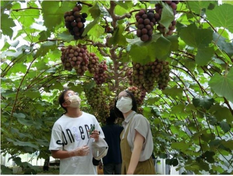今回はブドウを対象としたので、まず果樹園での果樹や果実の様子をよく観察してもらいました。同じ樹でも場所によって果実の色などが異なることを理解した後、等間隔で果実をサンプリングして、物理量の計測を行いました。計測したのは、直径や質量、色情報、糖度、酸度で、お手伝いの大学生の先輩の手ほどきを受けながら、数多くのデータを次々数値化していきました。