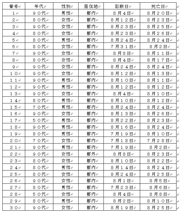 新型コロナウイルスに関連した患者の死亡について business Twitter Facebook はてブ Pocket LINE コピー 2022.08.29 この記事は約1分で読めます。 都内で新型コロナウイルスに感染した方が死亡されましたのでお知らせします。 お亡くなりになった方のご冥福をお祈り申し上げます。 ※ 患者・御家族の人権尊重・個人情報保護に御理解と御配慮をお願いします。
