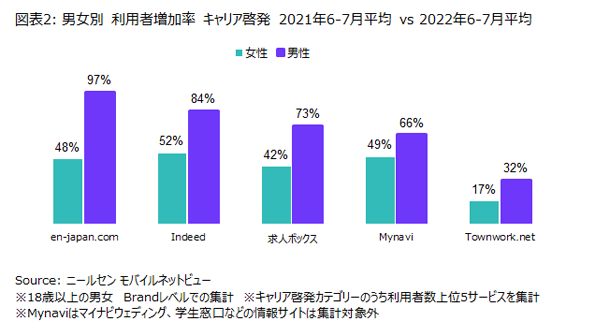 – 利用者数の最も多いIndeedとMynaviにおいては男性の増加率が最も高い