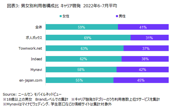 一方で、各サービスの性年齢構成比を見るとどのサービスも女性の割合が高くなっており、上位5サービス全体の性年代構成比としては女性が約6割を占めていました。特に求人ボックスでは女性が占める割合が69%となっていました。(図表3)。