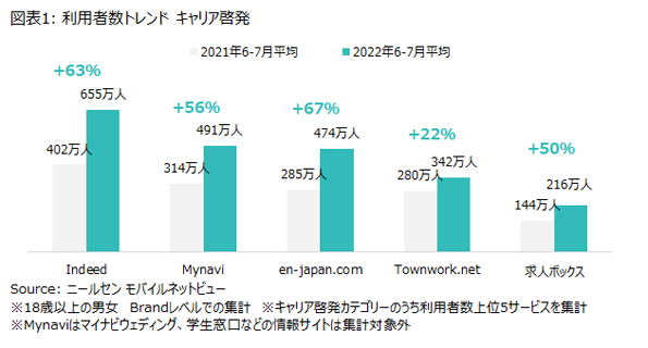 2022年6-7月の「ニールセン モバイル ネットビュー(Nielsen Mobile NetView) 」によると、キャリア啓発カテゴリの各サービスの利用者数は、昨年と比べて大きく増加していました。6-7月の平均利用者数のTOP5サービスのうち4サービスにおいて利用者数が昨年同月期から50%以上増加し、利用者数の最も多かったIndeedは63%増加して655万人、Mynaviは56%増加して491万人に利用されていました(図表1)。