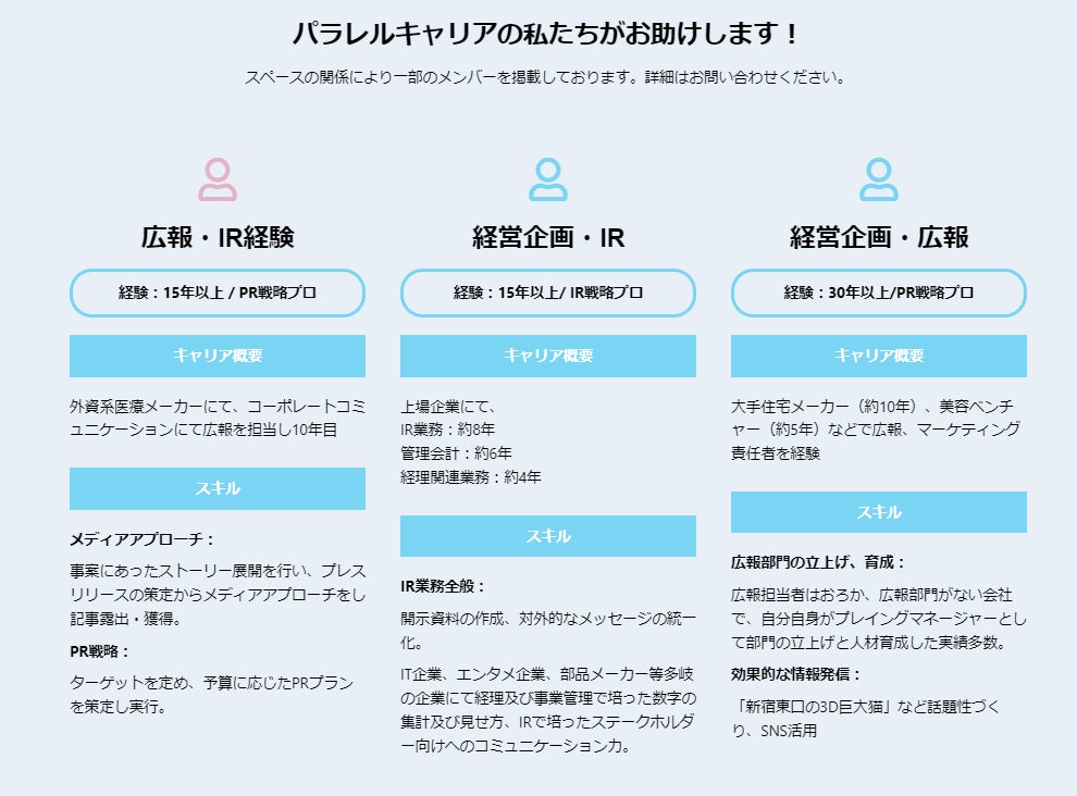 非財務情報作りの旗印となるPR戦略コンサル人材、社内外コミュニケーションを通じて非財務情報を「見える化」するライターや動画クリエイターなどのメディア人材。言語化された非財務情報を適切なタイミングで社内外に発信する広報PR・IR人材など、パラレルキャリアの集団だからこそできるサービスです。