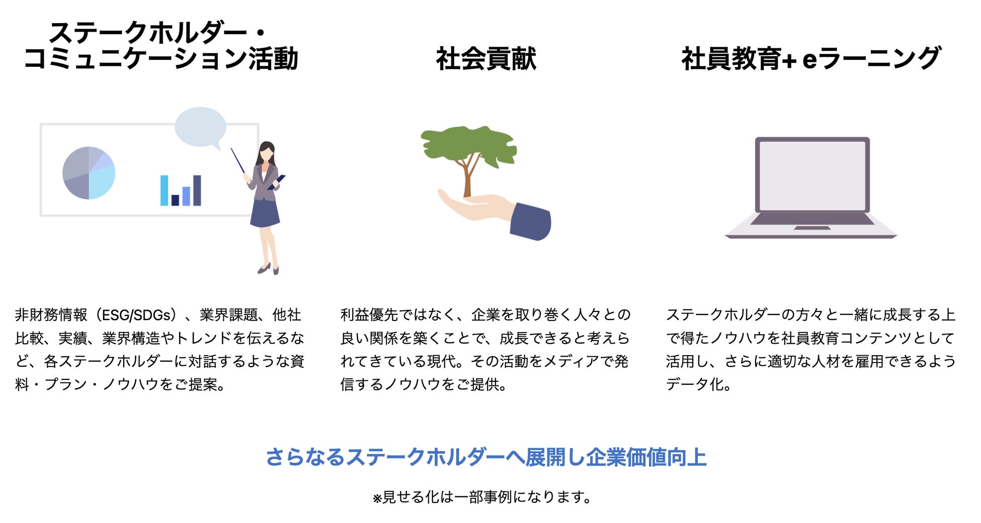サポートと同時に、私たちが持つノウハウを企業側に提供することで、自社内で最強のIR/広報を育成し、来るESG投資やIPOに向けた社内外の発信力強化に繋げます。