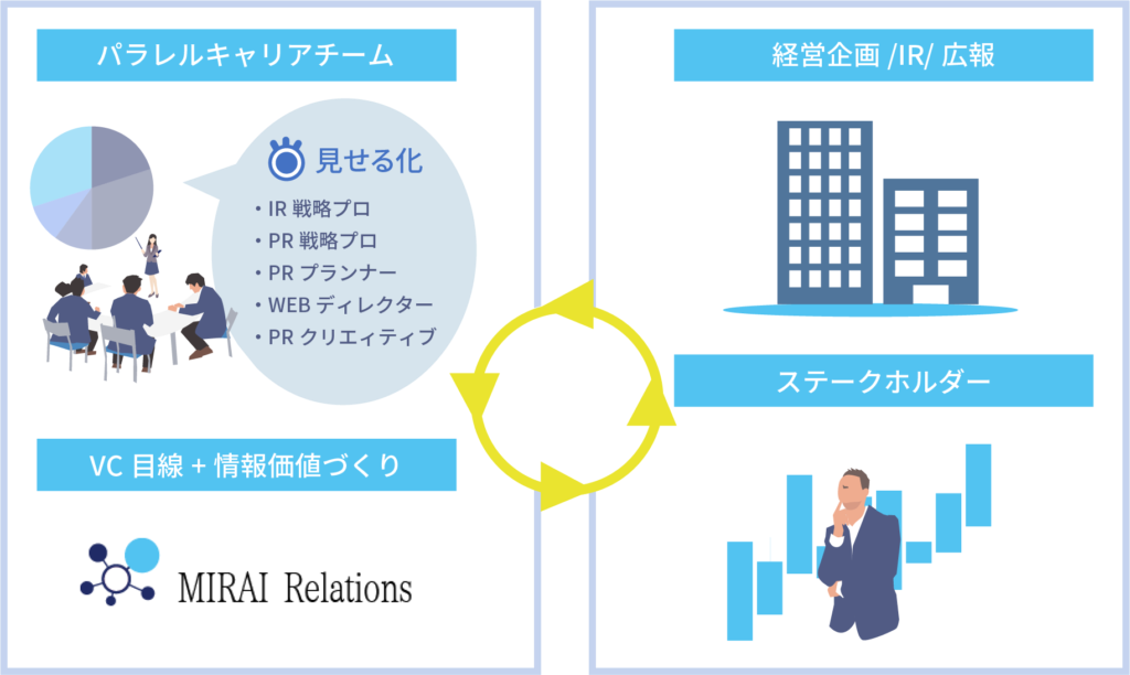 企業目線と社会貢献目線でステークホルダーの利害関係(非財務情報)を見せる化するパラレルキャリアチームと、VC目線でのステークホルダーとの価値づくりを得意とするみらいリレーションズが、御社のステークホルダーコミュニケーション活動を半内製化することで、より強固な情報価値をつくり、ステークホルダーリレーションズを推進いたします。