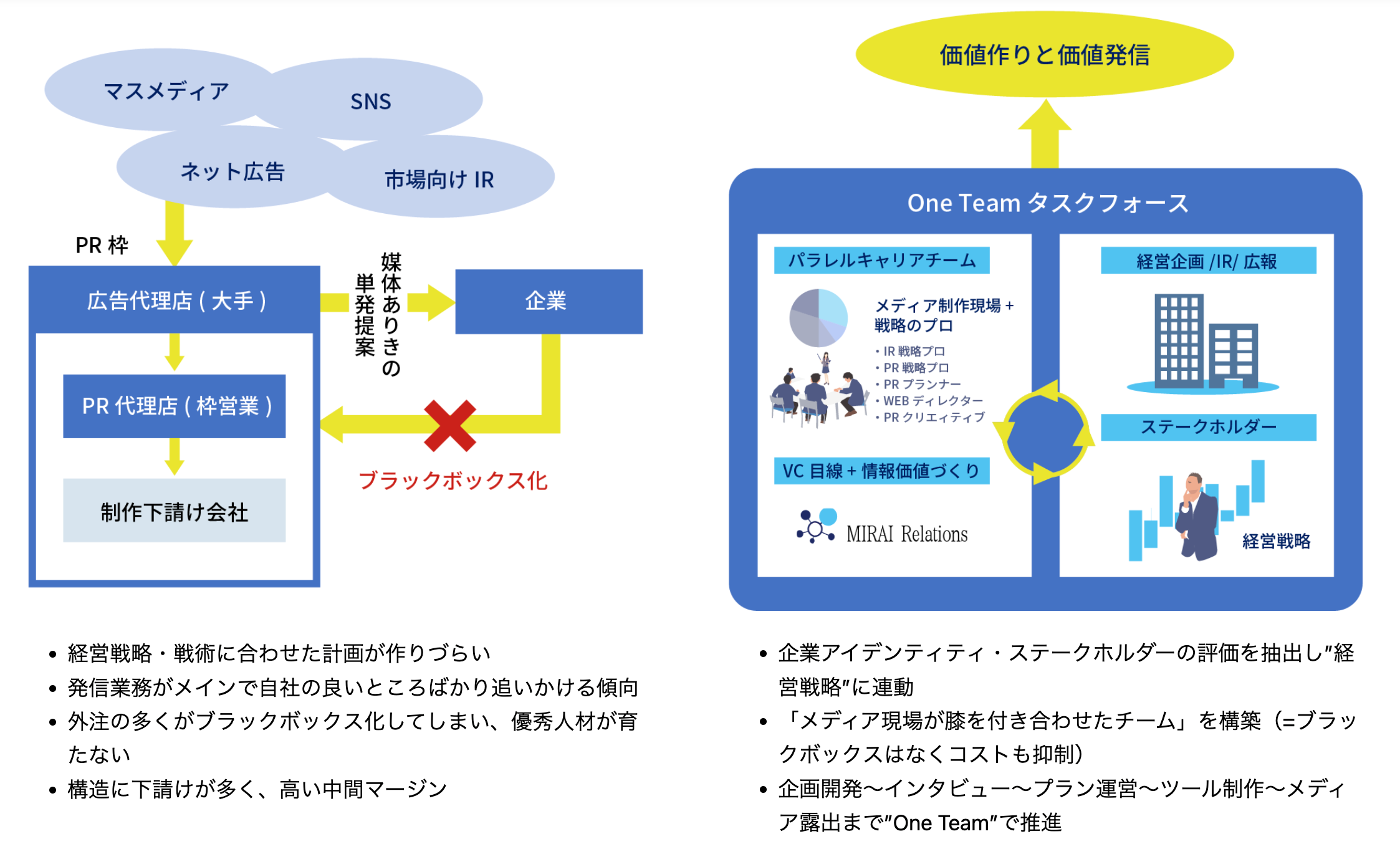 パラレルキャリアの人材がそれぞれ持つスキルを掛けあわせて、企業が本質的に抱えている課題を一気通貫で解決することが出来るのではないか。こうした想いから、みらいリレーションズはIR/広報半内製化サービスを作りました。