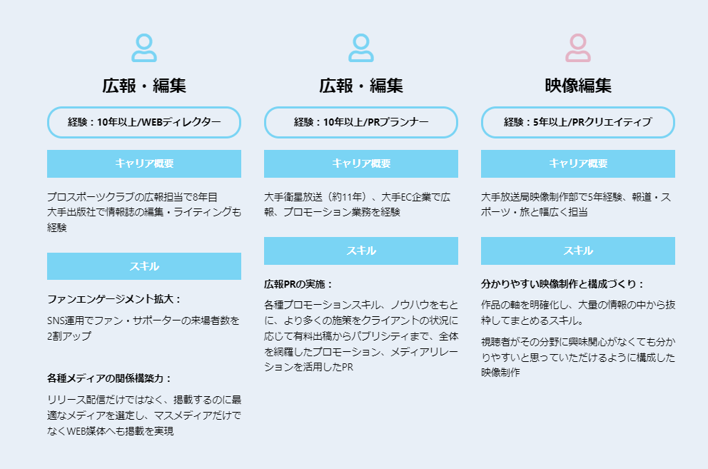 非財務情報作りの旗印となるPR戦略コンサル人材、社内外コミュニケーションを通じて非財務情報を「見える化」するライターや動画クリエイターなどのメディア人材。言語化された非財務情報を適切なタイミングで社内外に発信する広報PR・IR人材など、パラレルキャリアの集団だからこそできるサービスです。