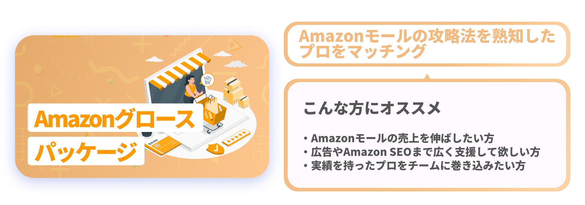 Amazonの運用実績が豊富なプロをマッチングして、効果的な出品方法・販売スケジュール・広告予算・ページ作成術から運用フローにいたるまで、EC事業主様の状況に合わせて並走支援を行います。